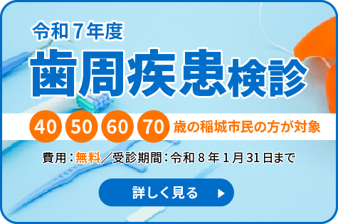稲城市では、後期高齢者の方の健康寿命を延ばすことを目的に、75歳・80歳歯科健康診査を実施しています。対象となる方には市から受診券が送付されます。当院は指定医院となっており、健診の内容は、摂食嚥下機能、咀嚼機能の簡単なチェックが中心です。痛みや治療を伴うものではなく、お口全体の健康状態を確認するためのものです。